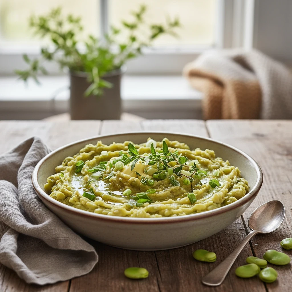 A simple and flavorful way to enjoy broad beans, especially when they are a bit older. This recipe involves boiling, skinning, and mashing the beans with butter and seasonings, optionally adding green onions and savory herbs for extra flavor.