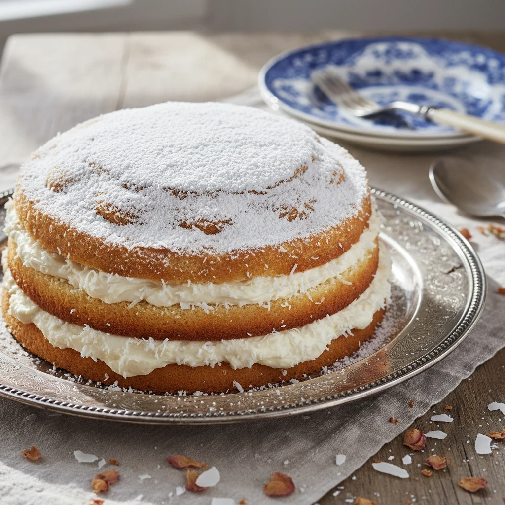A cake with layers of grated coconut and pastry cream, topped with sifted sugar.