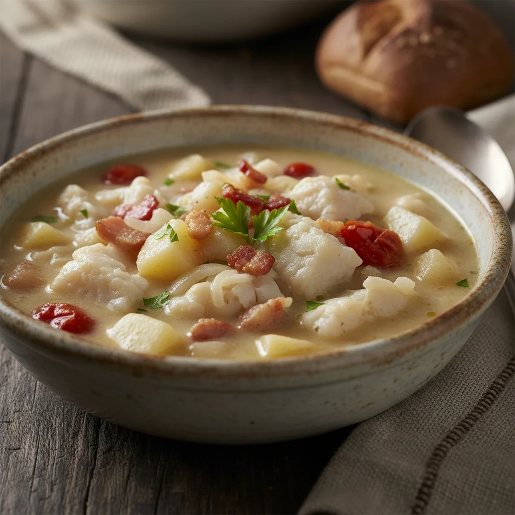 - 1Cut the bacon (or salt pork) into small dice. Fry in a large pot or Dutch oven over medium heat until crisp. Remove the bacon with a slotted spoon and set aside, leaving the rendered fat in the pot.