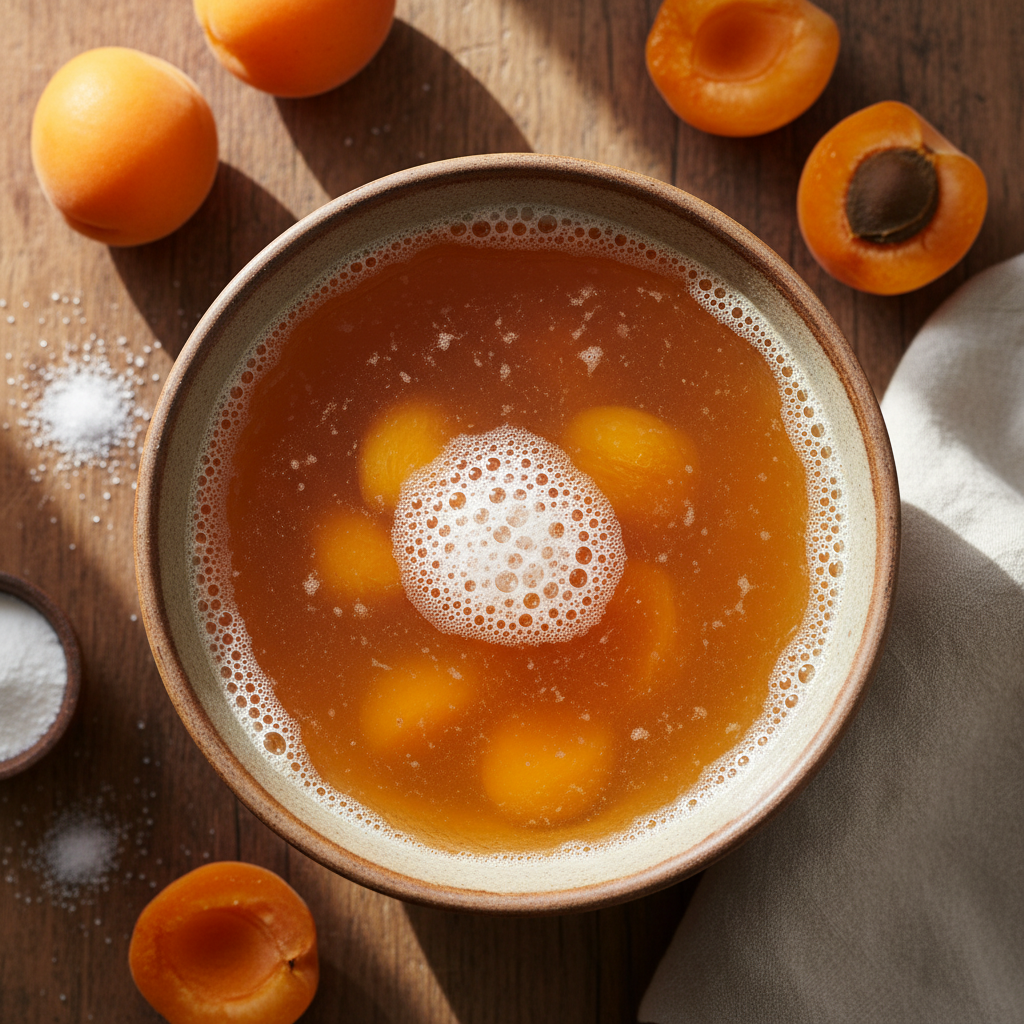 A refreshing homemade sparkling apricot drink made with apricot syrup and baking soda. The syrup is prepared in advance and mixed with carbonated water when ready to serve.