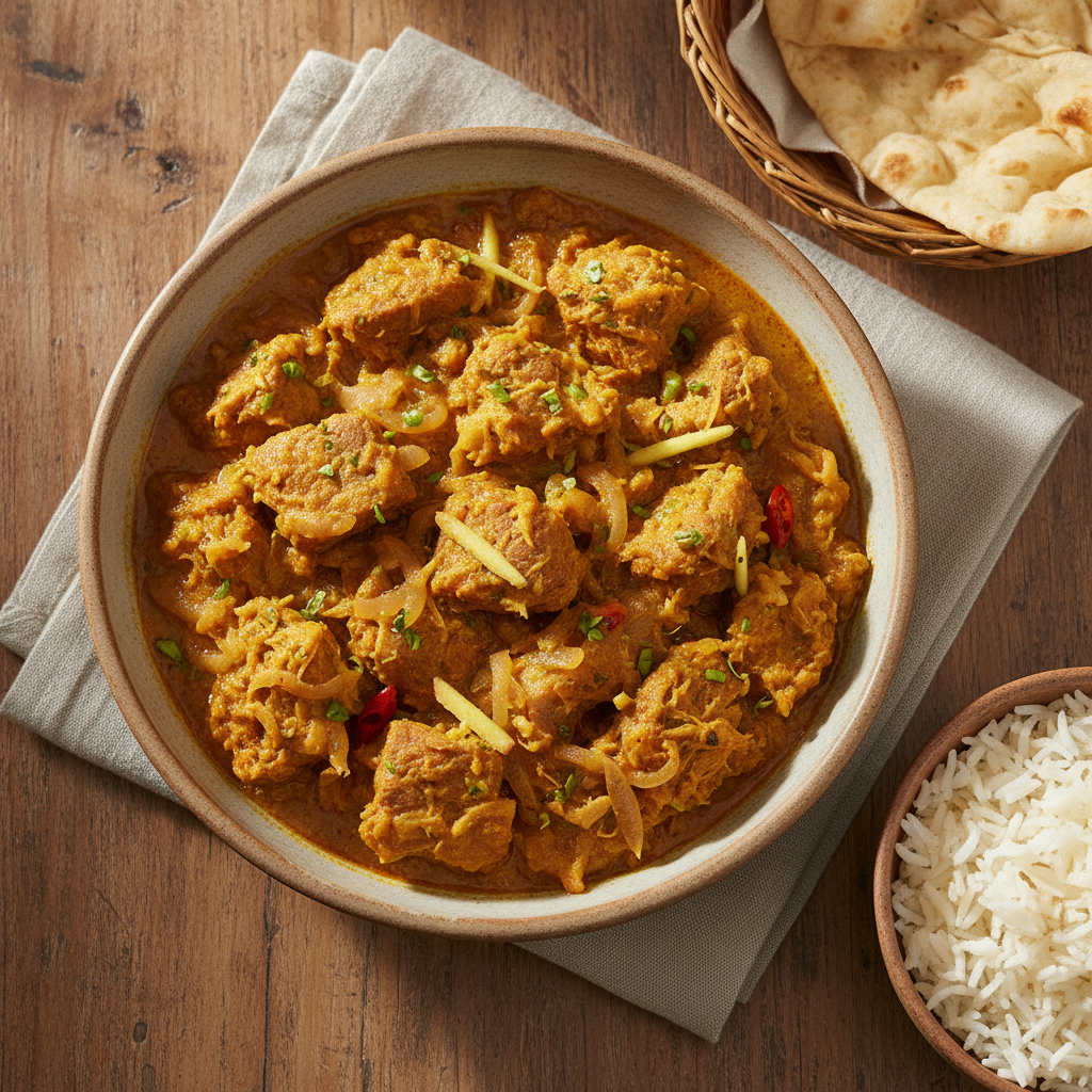 A flavorful curry made from leftover boiled pork, cooked with onions, spices, and tamarind in the traditional doopiaja style. This economical dish transforms cold meat into a rich, aromatic curry.