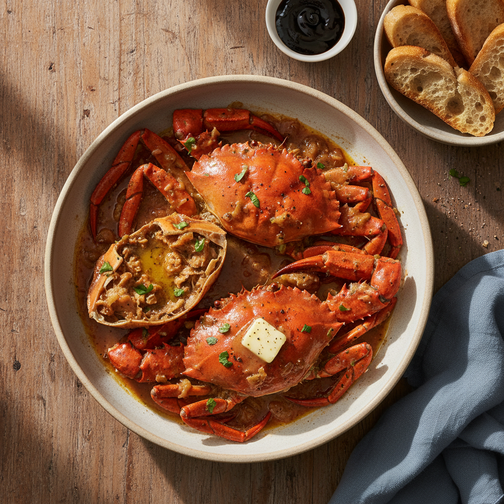 A classic stuffed crab dish where crab meat is seasoned with aromatics, fried in butter, then returned to the shells, topped with coral and breadcrumbs, and baked until golden.