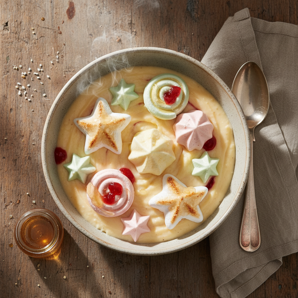 A Victorian-era decorative meringue topping for custards and creams, whisked with syrup or jelly to create elegant peaked ornaments that can be colored with natural dyes.