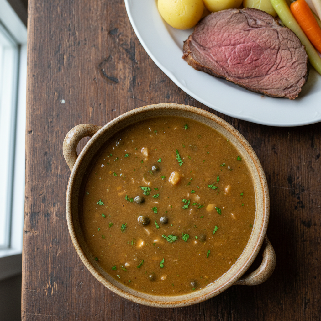 A savory onion and caper sauce with parsley and gravy, perfect for serving over boiled beef. This classic sauce adds richness and flavor to simple boiled meats.