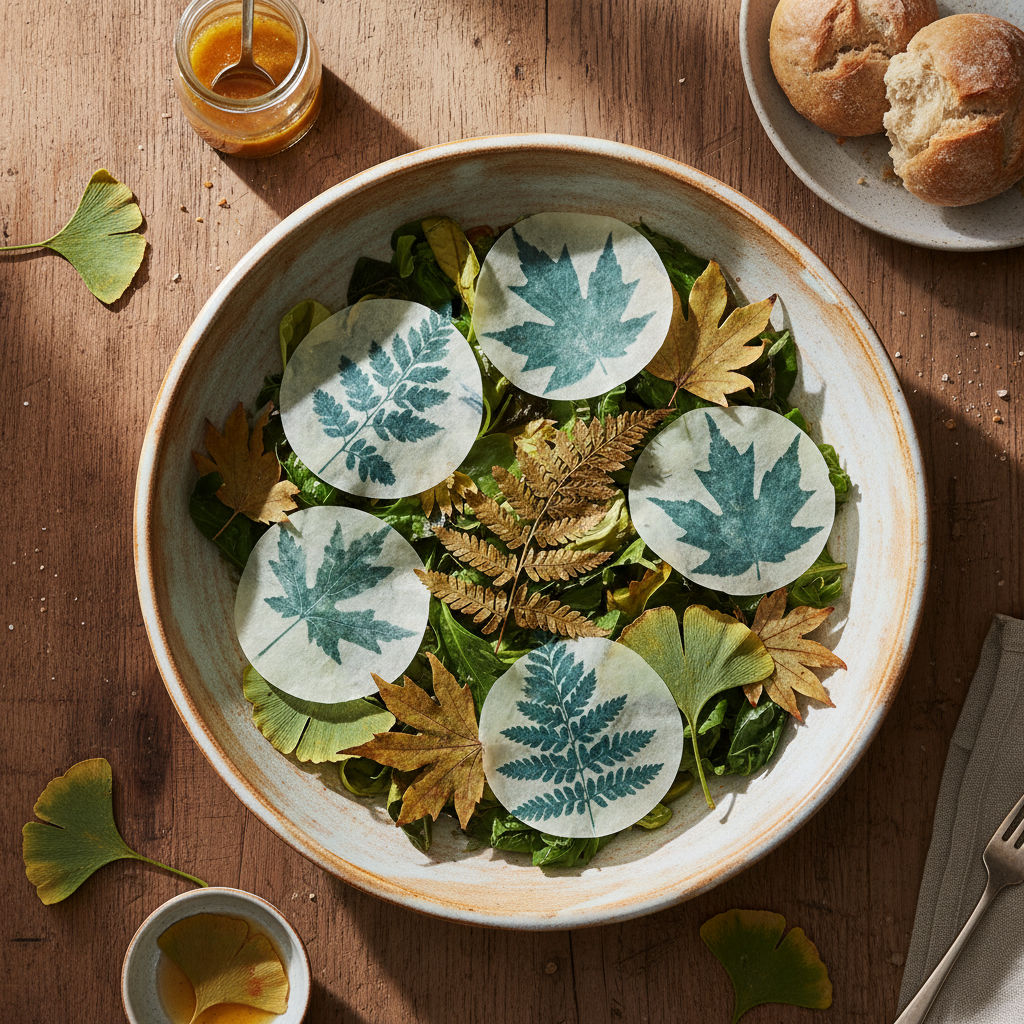 A historical photographic process using potassium dichromate to create beautiful botanical prints. When exposed to sunlight, the chemical creates a dark brown background with light lemon-colored leaf impressions. This is a vintage alternative photography technique.