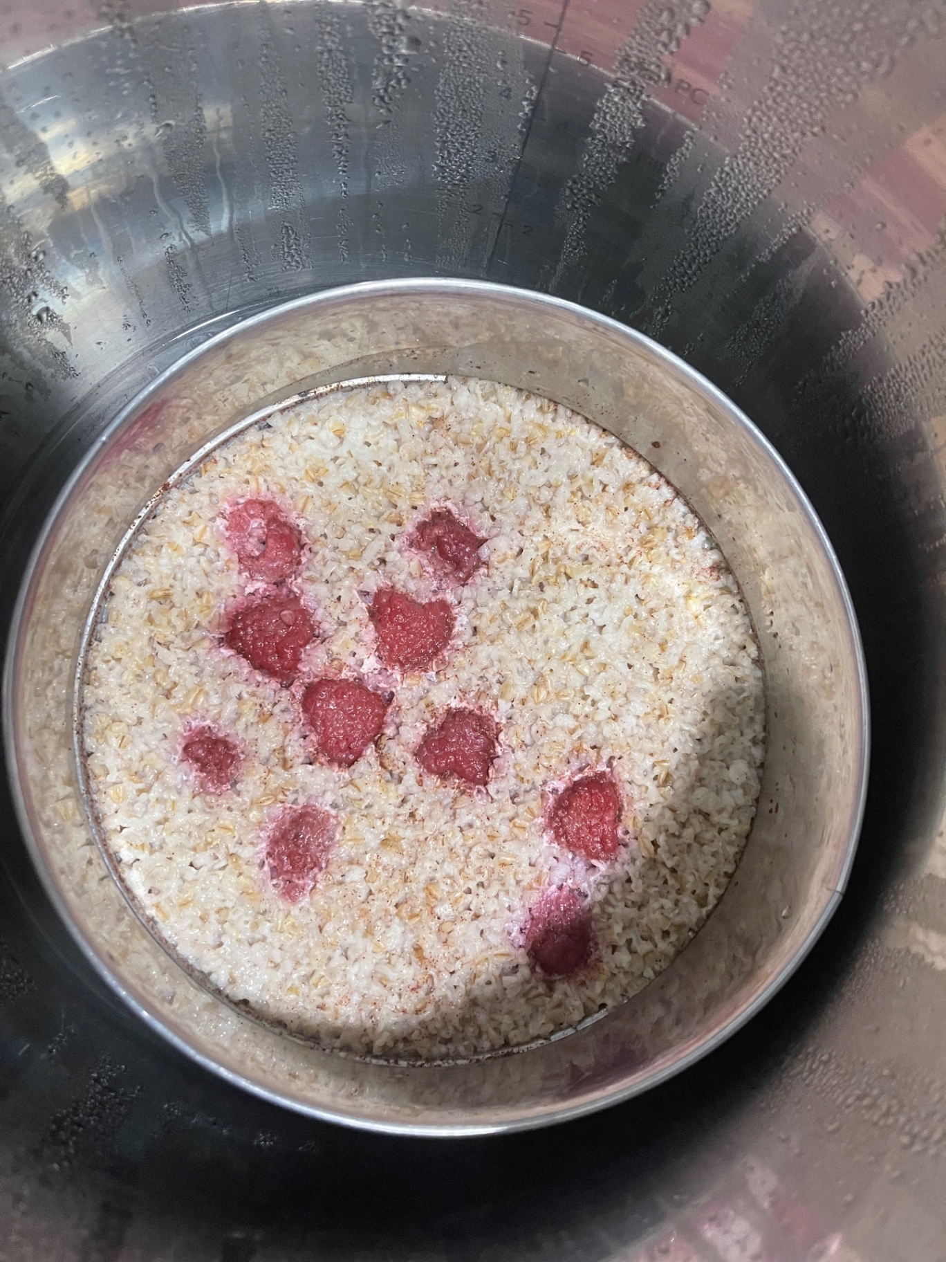 - 1Combine the steel cut oats, cinnamon powder, whole milk, water, and raspberries in the inner pot of an Instant Pot. Ensure the oats to liquid ratio is 1:3.